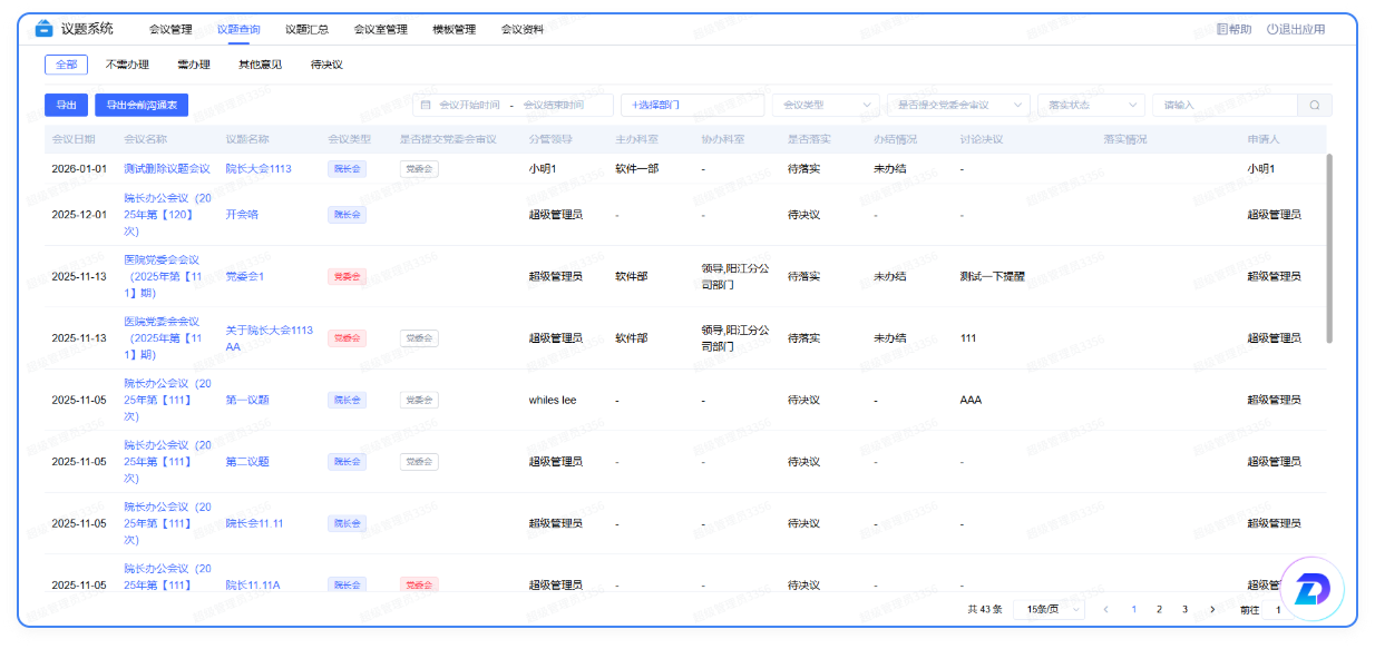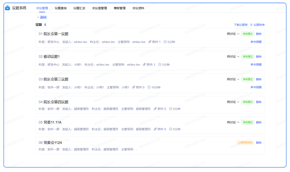 议题申请流程发起后自动流转至部门领导、党政办公室等节点进行审批,审批通过后进入议题库。