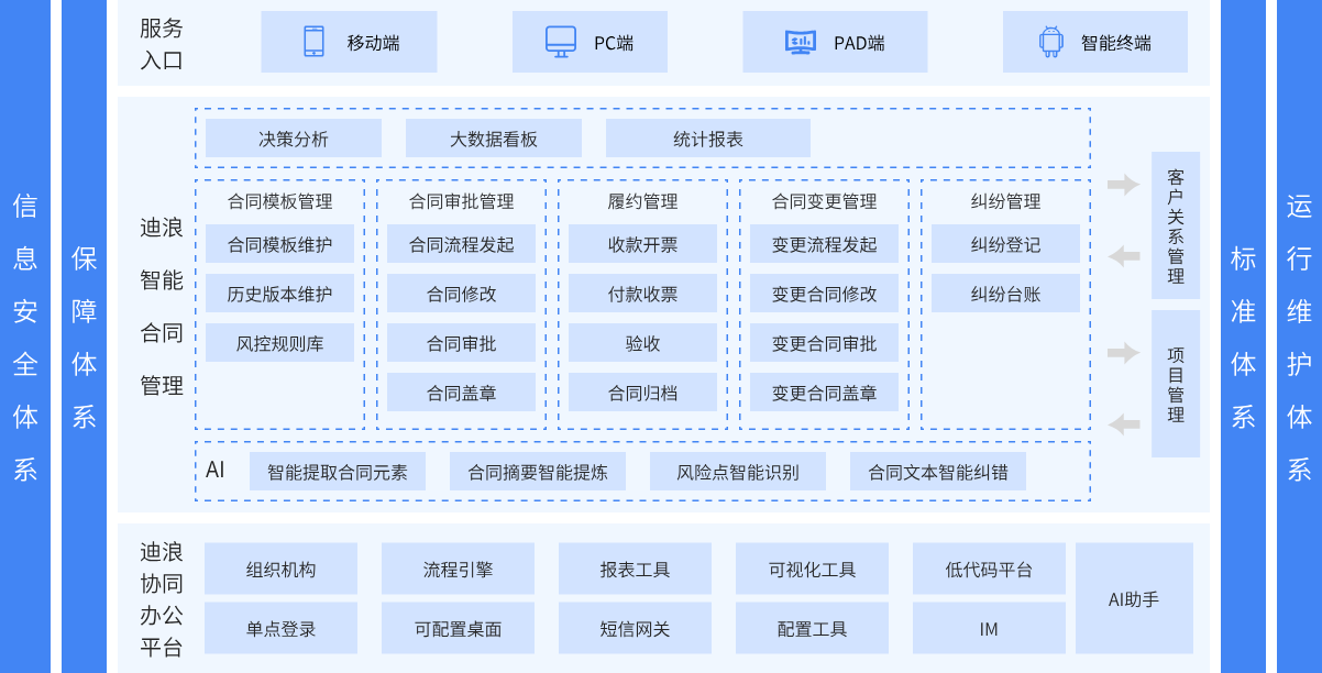 迪浪智能合同管理系统是迪浪科技基于协同办公平台(OA)开发的一套融合AI技术的全生命周期合同管理解决方案。该系统以“AI赋能、合规风控、流程闭环”为核心,旨在帮助企业实现合同管理的数字化、智能化、标准化,提升合规水平与运营效率。