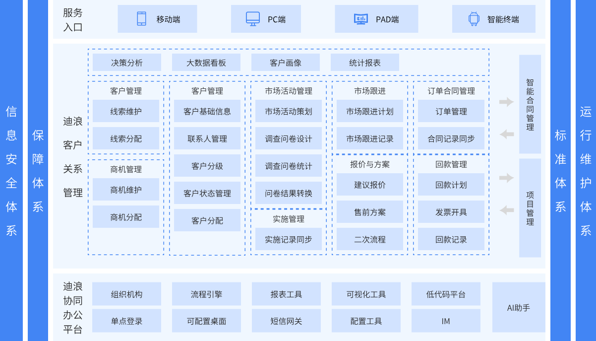 迪浪客户关系管理系统(CRM)是一款高效协同的客户管理解决方案,深度集成迪浪协同办公平台能力,帮助企业解决客户资料分散、信息不同步等痛点。系统支持多端实时同步(PC/手机/微信),实现客户信息规范化集中管理,具备智能搜索、一键共享和离职员工资料转移等功能,提升团队协作效率。通过客户数据分析强化精准维护,支持大客户重点跟进与老客户二次营销,内置关键节点自动提醒机制,避免客户流失。全面替代传统Excel管理方式,助力企业实现移动化、智能化的客户全生命周期管理。