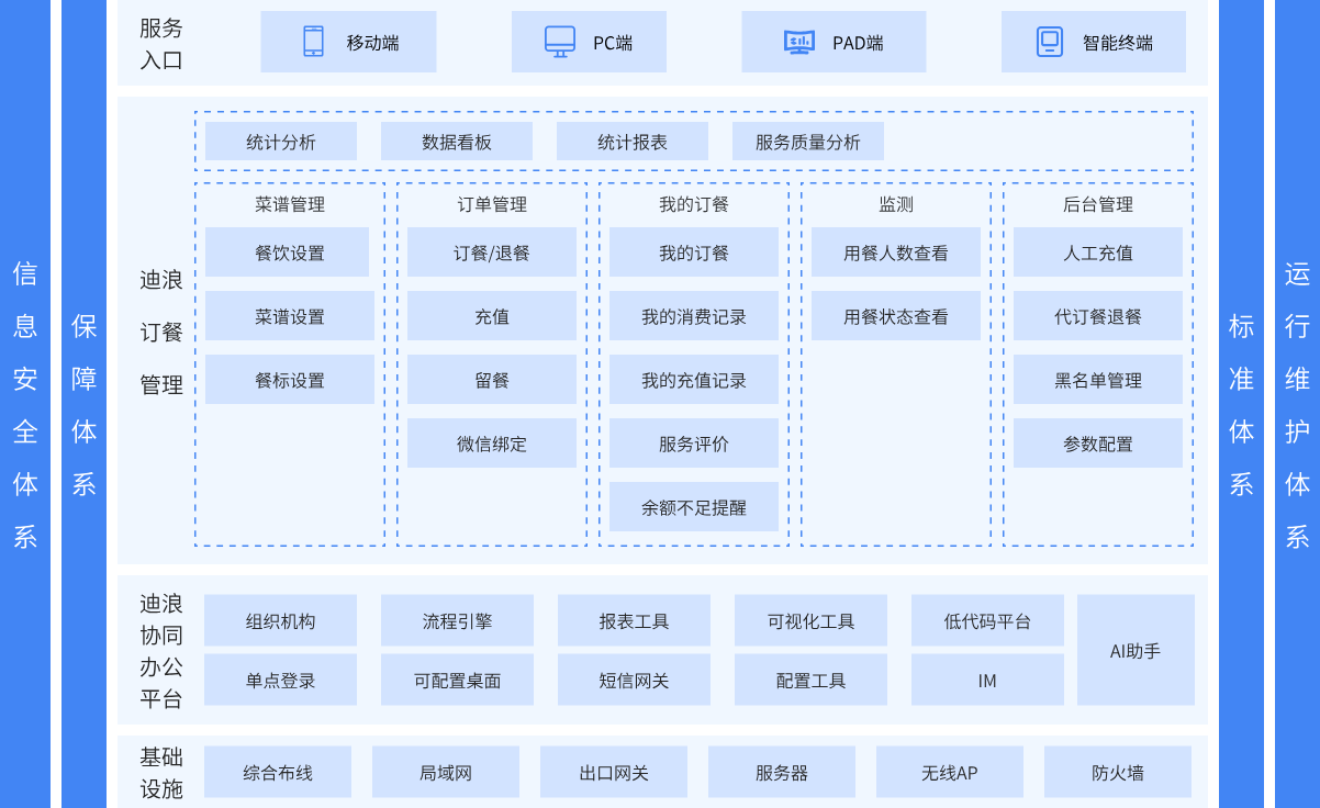 迪浪订餐管理系统通过复用迪浪协同办公平台的能力,专为政企单位打造PC+移动端一体化订餐服务方案。员工可预先通过手机选餐并支付,系统精准汇总订餐数据,助力食堂精准备餐,有效减少食物浪费。后台涵盖菜单管理、营养标识、满意度调研及多维度统计报表,助力后勤部门不断优化菜品与服务,切实提升员工就餐满意度。
