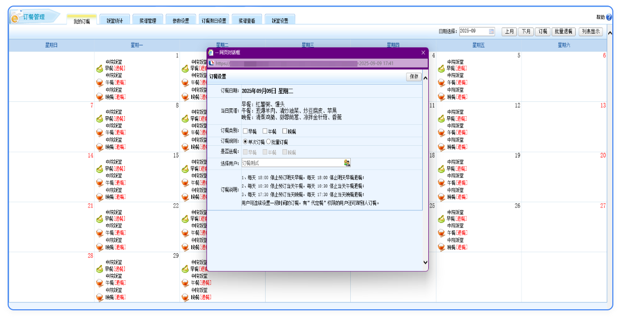 设置每天早、中、晚餐的菜谱,如果不开餐则留空; 设置每个餐次的就餐时段。