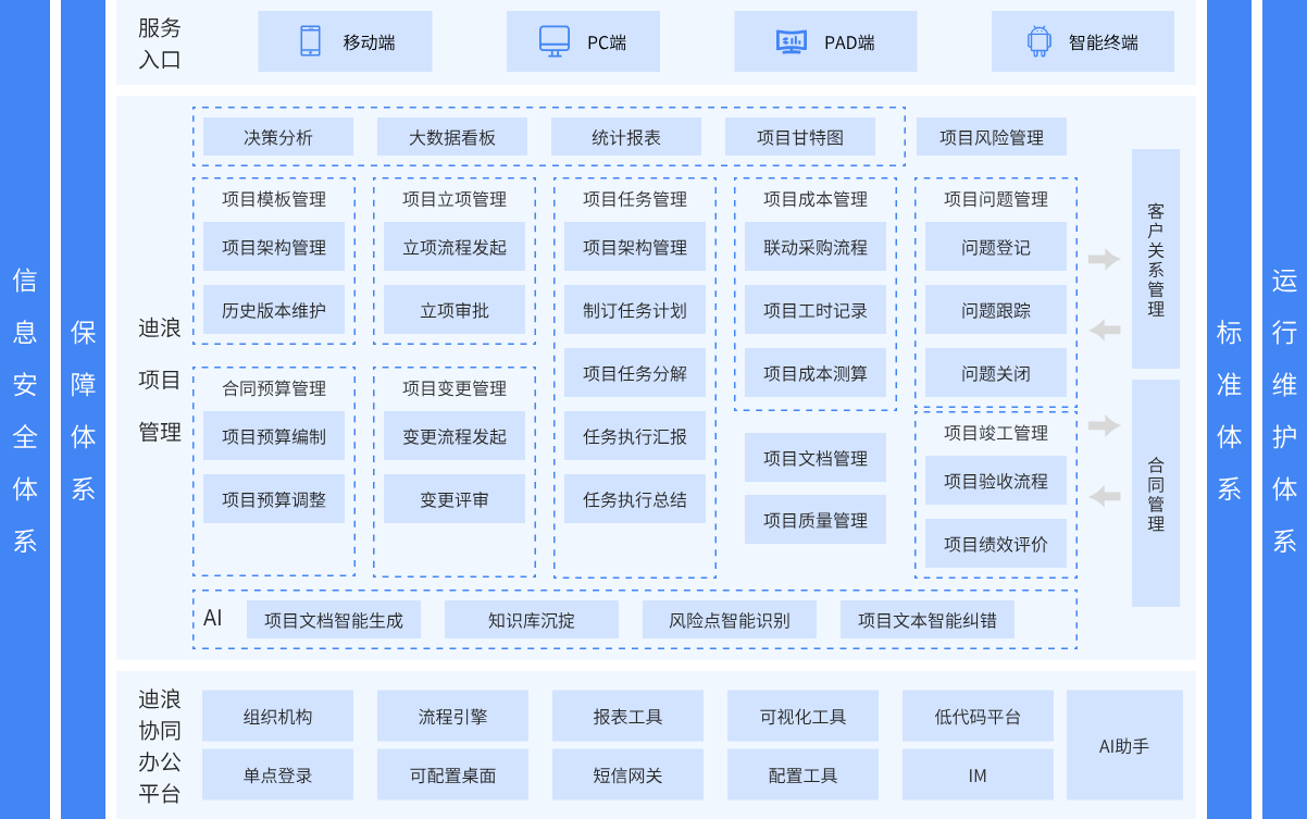 迪浪项目管理系统是一款面向政企及工程领域的一体化、数字化项目管理平台。该系统以项目全生命周期管理为核心,覆盖项目立项、计划制定、任务分派、进度跟踪、成本控制、资源协调、风险预警到成果归档的全过程。它通过集成化的数据看板实现项目进度、成本和质量的实时可视化监控,有效解决项目信息不透明、流程协同效率低、资源分配不合理等核心痛点,旨在提升团队协作效率,确保项目在预算内按时高质量交付,最终实现项目投资回报最大化。