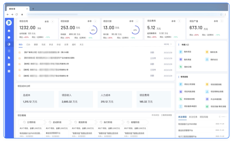 依托项目全生命周期管理,构建了涵盖前期策划、立项创建、任务规划、执行反馈、成果归档、成本控制、过程监控及验收结案的全链条管理平台,实现了信息高度透明,有效增强了组织间的业务协同效率,确保项目管理流程的严谨与高效。
