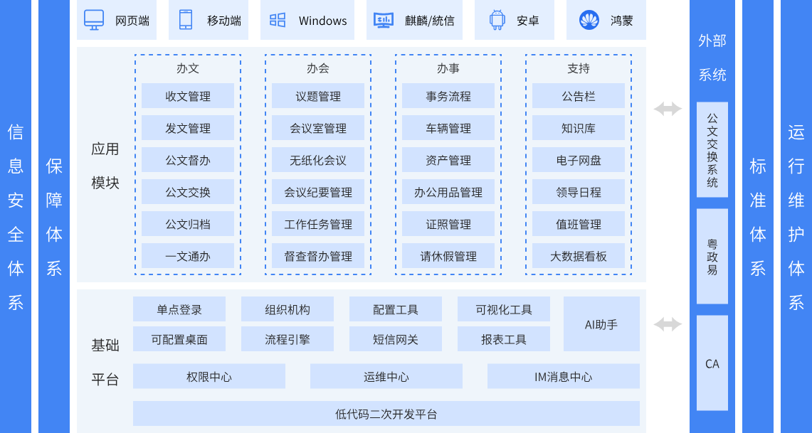 软件采用J2EE架构,支持国产操作系统、数据库、中间件、国产硬件。取得数十家信创厂商的适配认证,满足党政机关及国有企事业单位的信创办公需求。