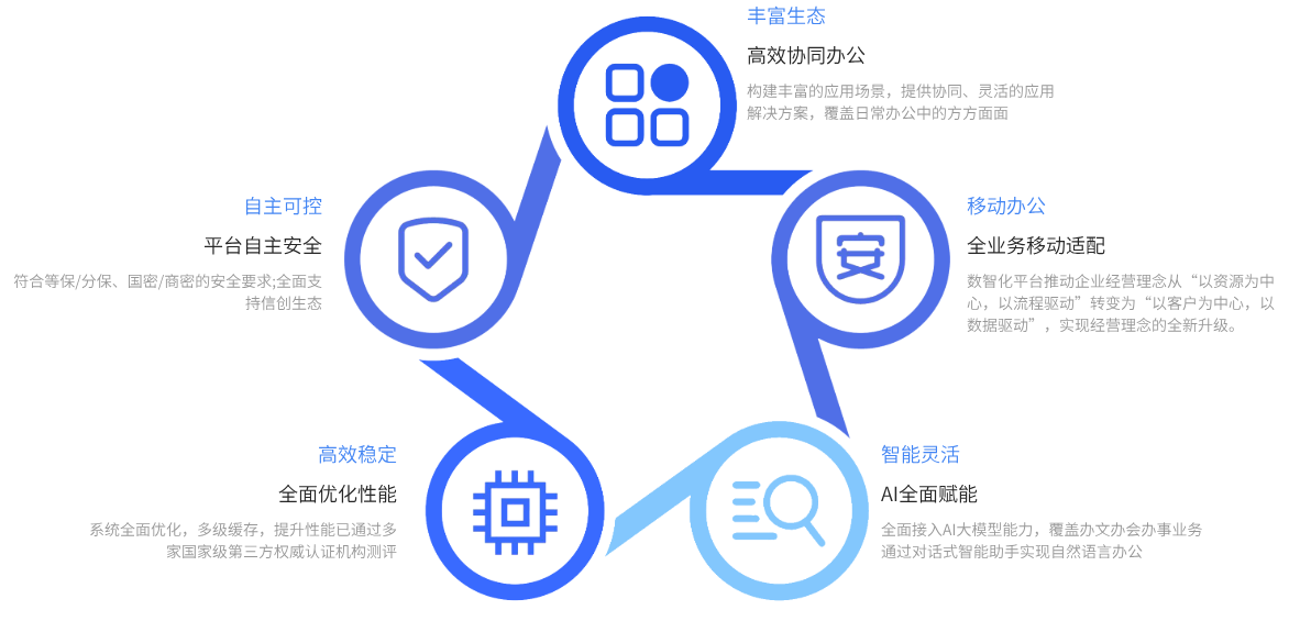 依托AI大模型能力,贯通公文撰写、校对、摘要与决策全流程,全面提升办文质量;通过AI会议纪要与智能数据分析,显著增强办会办事效率;结合MCP技术与对话式智能助手,实现系统级的全场景对话式办公体验。