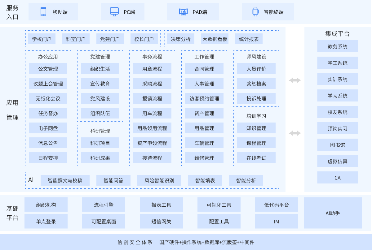 科研项目管理: 为院校打造全过程科研项目管理体系,从项目申报、立项、执行到结项全程跟踪,科研经费自动管控与预警,全面适配国产数据库环境。行政办公协同:构建数字化行政办公体系,实现公文流转、会议管理、事务审批等工作的全程电子化,支持国产操作系统和办公软件。校园后勤管理:实现智能化资产管理、工单管控、餐饮管理、安防管理等后勤服务数字化,全面兼容国产化软硬件环境。人事人才管理:构建完善的人才档案管理系统,实现人才引进、职称评审、绩效考核等全流程数字化管理,确保人事数据安全可控。智能决策支持:为校领导提供数据驱动的决策支持,涵盖行政、科研、人事、后勤等多维度分析。
