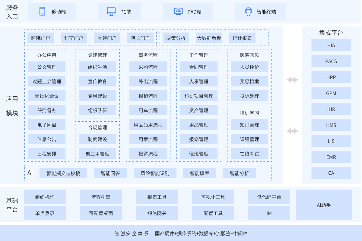 已获得麒麟、统信、鲲鹏、鸿蒙、海光、飞腾、龙芯、申威、兆芯、达梦、人大金仓、金山办公、福昕、东方通等主流国产软硬件的信创适配认证,构建了从芯片、操作系统、数据库到中间件、应用层的端到端全栈信创体系,实现了关键组件的安全自主可控与无缝协同,助力医疗机构OA信创升级。